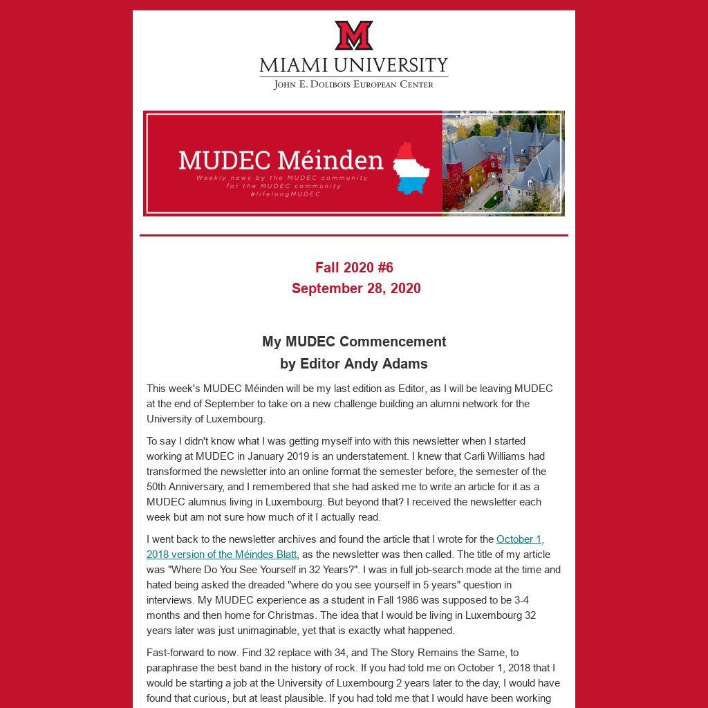 To say I didn't know what I was getting myself into with this newsletter when I started working at MUDEC in January 2019 is an understatement. I knew that Carli Williams had transformed the newsletter into an online format the semester before, the semester of the 50th Anniversary, and I remembered that she had asked me to write an article for it as a MUDEC alumnus living in Luxembourg. But beyond that? I received the newsletter each week but am not sure how much of it I actually read.