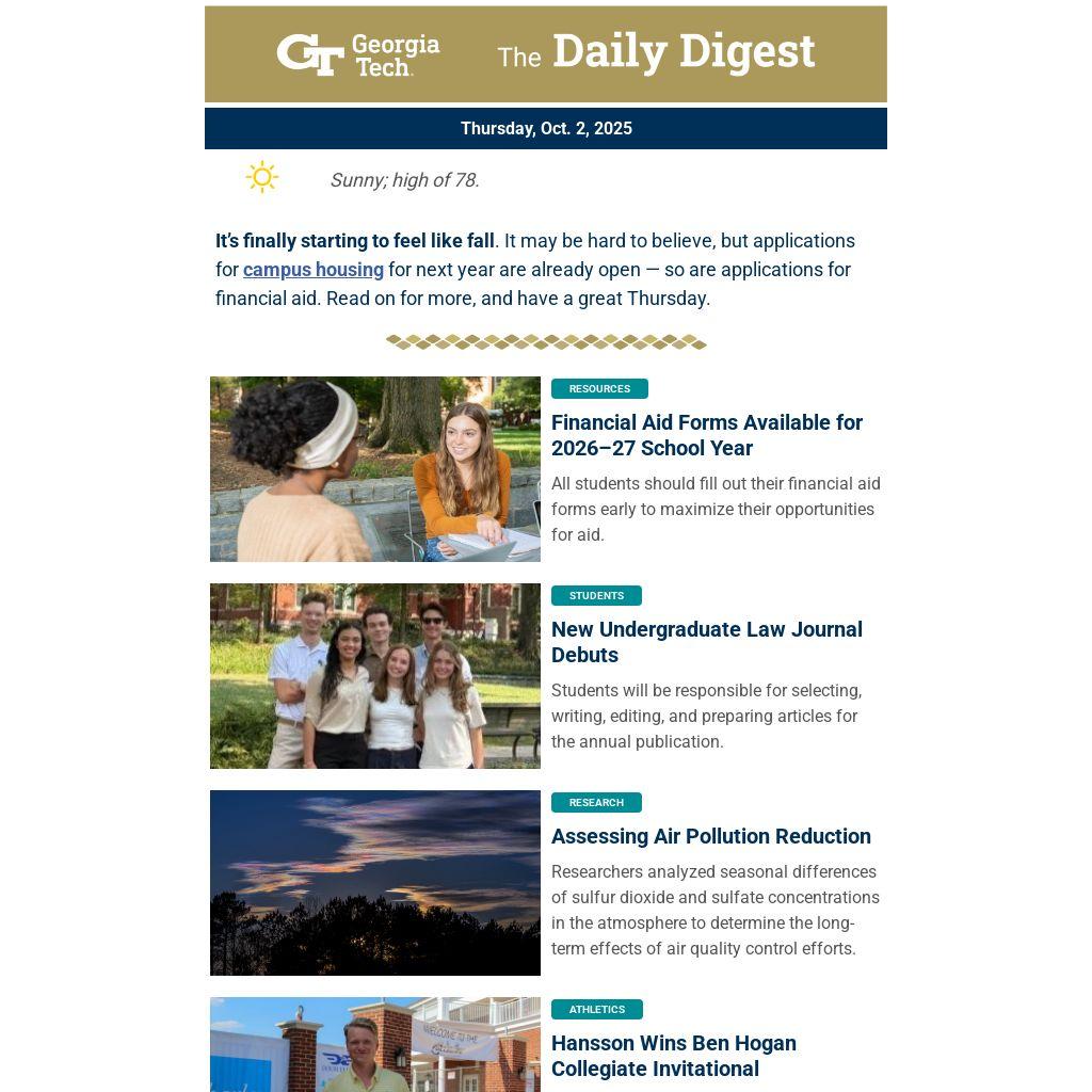 It’s finally starting to feel like fall. It may be hard to believe, but applications for campus housing for next year are already open — so are applications for financial aid. Read on for more, and have a great Thursday.