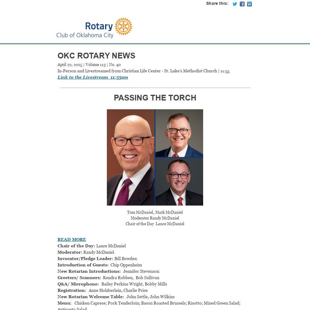 OKC ROTARY NEWSApril 22, 2025 | Volume 113 | No. 40 In-Person and Livestreamed from Christian Life Center - St. Luke's Methodist Church | 11:55