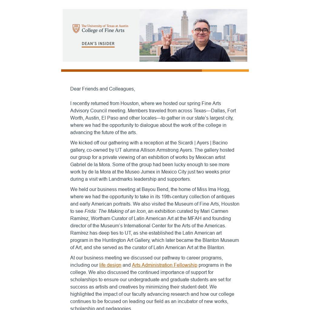I recently returned from Houston, where we hosted our spring Fine Arts Advisory Council meeting. Members traveled from across Texas—Dallas, Fort Worth, Austin, El Paso and other locales—to gather in our state’s largest city, where we had the opportunity to dialogue about the work of the college in advancing the future of the arts.