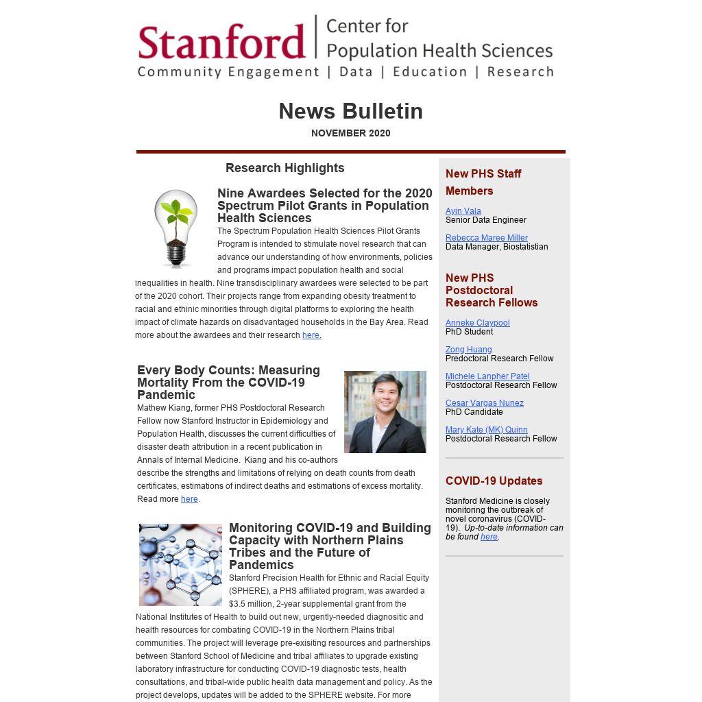 Stanford Precision Health for Ethnic and Racial Equity (SPHERE), a PHS affiliated program, was awarded a $3.5 million, 2-year supplemental grant from the National Institutes of Health to build out new, urgently-needed diagnositic and health resources for combating COVID-19 in the Northern Plains tribal communities. The project will leverage pre-exisiting resources and partnerships between Stanford School of Medicine and tribal affiliates to upgrade existing laboratory infrastructure for conducting COVID-19 diagnostic tests, health consultations, and tribal-wide public health data management and policy. As the project develops, updates will be added to the SPHERE website. For more information, visit the SPHERE website here.