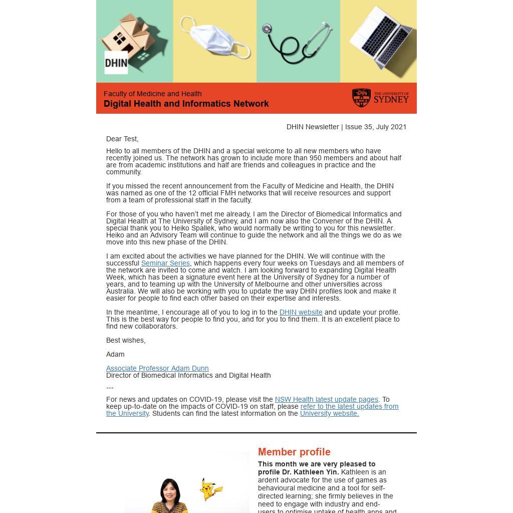 For those of you who haven’t met me already, I am the Director of Biomedical Informatics and Digital Health at The University of Sydney, and I am now also the Convener of the DHIN. A special thank you to Heiko Spallek, who would normally be writing to you for this newsletter. Heiko and an Advisory Team will continue to guide the network and all the things we do as we move into this new phase of the DHIN.