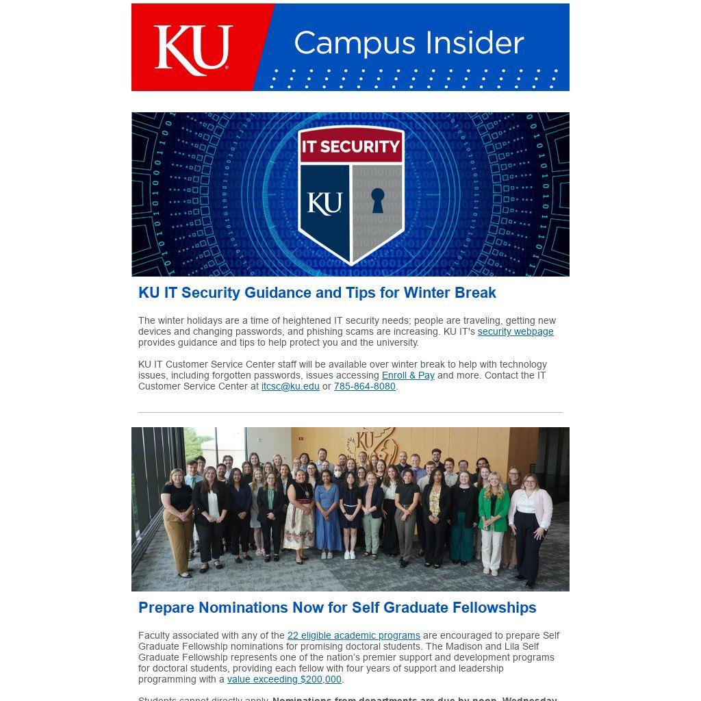 The winter holidays are a time of heightened IT security needs; people are traveling, getting new devices and changing passwords, and phishing scams are increasing. KU IT's security webpage provides guidance and tips to help protect you and the university.