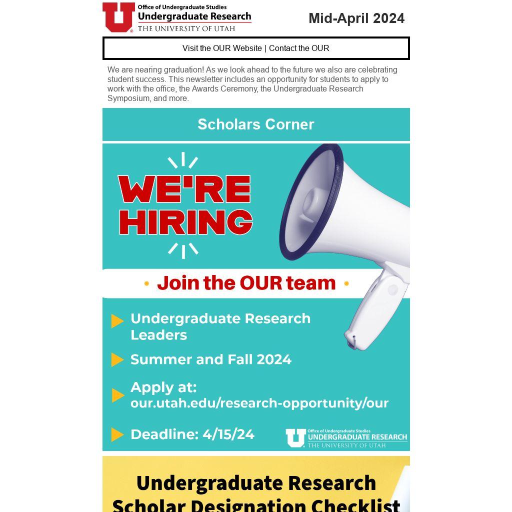 We are nearing graduation! As we look ahead to the future we also are celebrating student success. This newsletter includes an opportunity for students to apply to work with the office, the Awards Ceremony, the Undergraduate Research Symposium, and more.