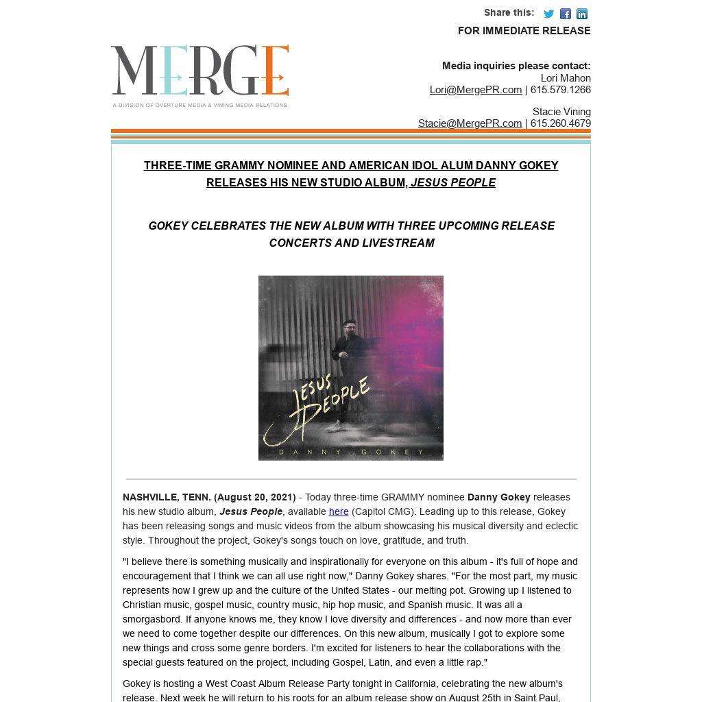 | THREE-TIME GRAMMY NOMINEE AND AMERICAN IDOL ALUM DANNY GOKEY RELEASES HIS NEW STUDIO ALBUM, JESUS PEOPLE