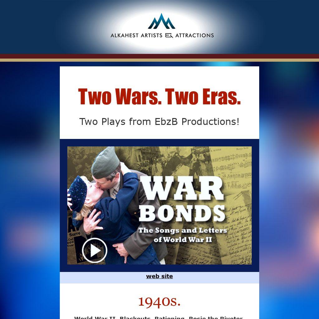 WAR BONDS: The Songs and Letters of World War II is a musical and living history cabaret interspersed with actual veteran's personal letters and headline newsfrom the Front. It captures the dark side of war and the strange juxtaposition of the light hearted, popular tunes of the time that kept people going, even as the atrocities and sacrifices of war surrounded them.