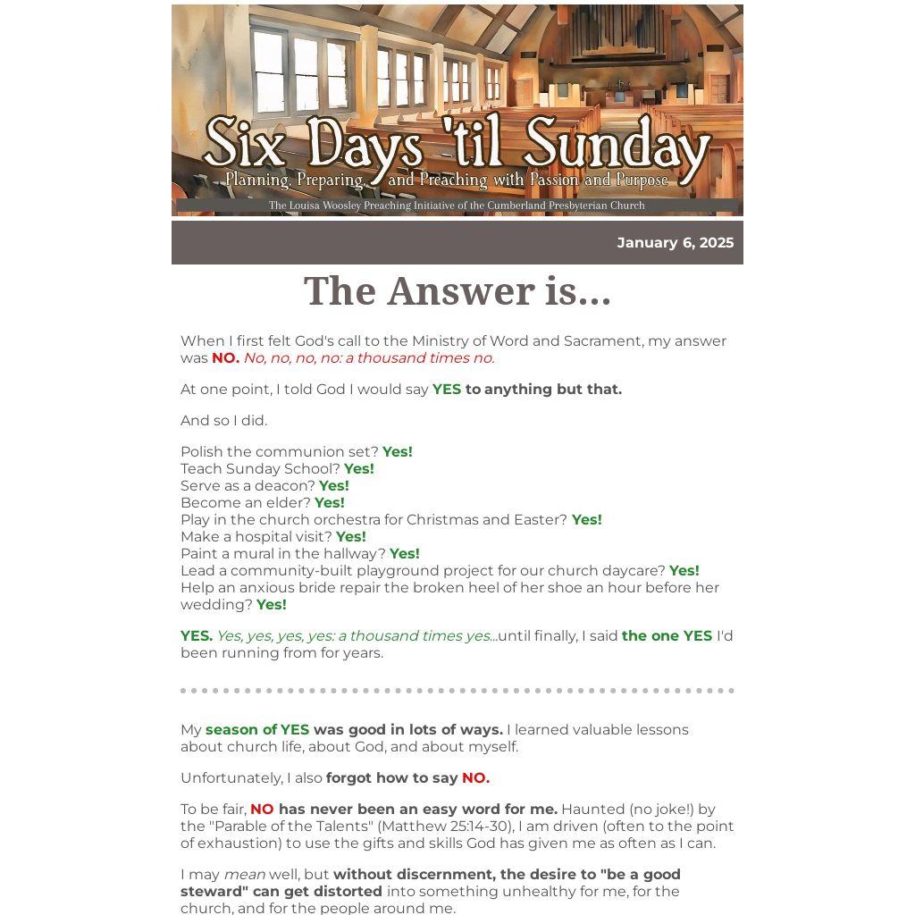 There are a dozen perfectly "good" things you could say YES to today. May God grant you the wisdom and courage to say NO wisely--and to say YES in loving, faithful, discerning, and self-disciplined ways.