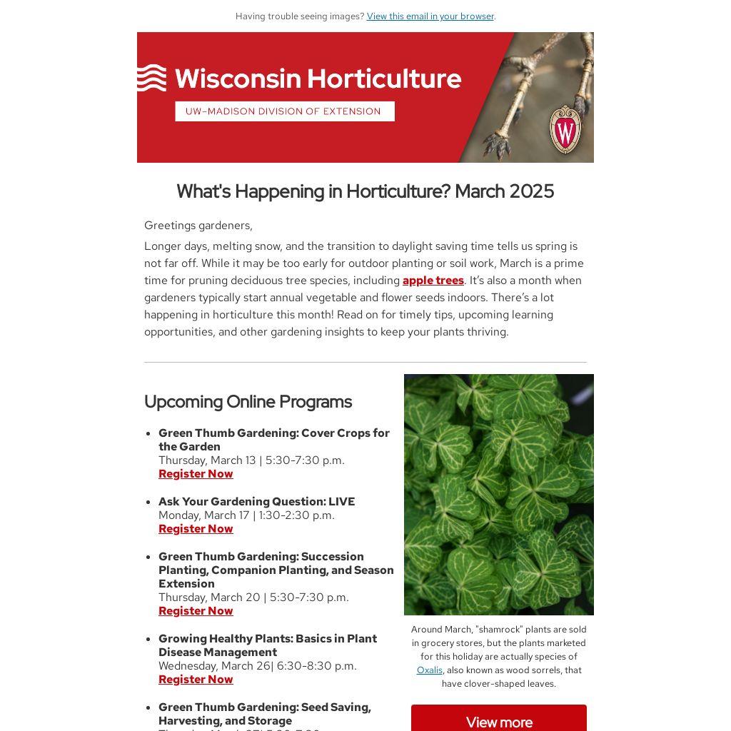 Longer days, melting snow, and the transition to daylight saving time tells us spring is not far off. While it may be too early for outdoor planting or soil work, March is a prime time for pruning deciduous tree species, including apple trees. It’s also a month when gardeners typically start annual vegetable and flower seeds indoors. There’s a lot happening in horticulture this month! Read on for timely tips, upcoming learning opportunities, and other gardening insights to keep your plants thriving.
