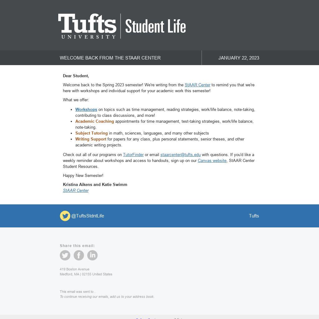 Welcome back to the Spring 2023 semester! We're writing from the StAAR Center to remind you that we're here with workshops and individual support for your academic work this semester!