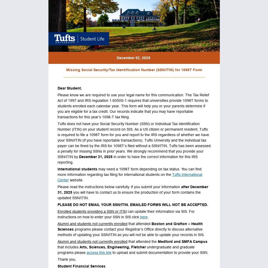 Tufts does not have your Social Security Number (SSN) or Individual Tax Identification Number (ITIN) on your student record on SIS. As a US citizen or permanent resident, Tufts is required to file a 1098T form for you and report to the IRS regardless of whether we have your SSN/ITIN (if you have reportable transactions). Tufts University and the individual tax payer can be fined by the IRS for 1098T’s filed without a SSN/ITIN. Tufts has been assessed a penalty for missing SSNs in prior years. We strongly recommend that you provide your SSN/ITIN by December 31, 2025 in order to have the correct information for this IRS reporting.