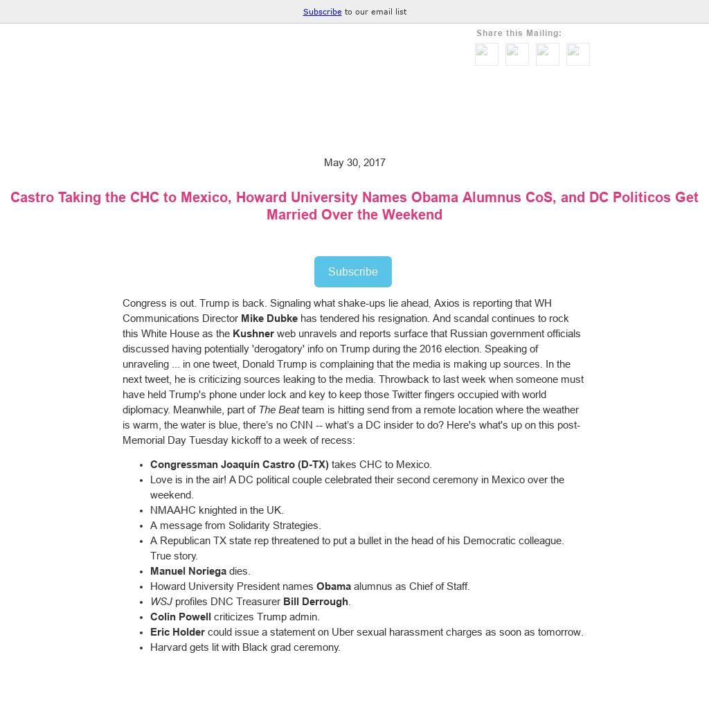 Congress is out. Trump is back. Signaling what shake-ups lie ahead, Axios is reporting that WH Communications Director Mike Dubke has tendered his resignation. And scandal continues to rock this White House as the Kushner web unravels and reports surface that Russian government officials discussed having potentially 'derogatory' info on Trump during the 2016 election. Speaking of unraveling ... in one tweet, Donald Trump is complaining that the media is making up sources. In the next tweet, he is criticizing sources leaking to the media. Throwback to last week when someone must have held Trump's phone under lock and key to keep those Twitter fingers occupied with world diplomacy. Meanwhile, part of The Beat team is hitting send from a remote location where the weather is warm, the water is blue, there’s no CNN -- what’s a DC insider to do? Here's what's up on this post-Memorial Day Tuesday kickoff to a week of recess:- Congressman Joaquín Castro (D-TX) takes CHC to Mexico.