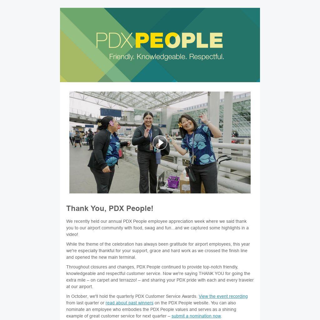 Throughout closures and changes, PDX People continued to provide top-notch friendly, knowledgeable and respectful customer service. Now we're saying THANK YOU for going the extra mile – on carpet and terrazzo! – and sharing your PDX pride with each and every traveler at our airport.