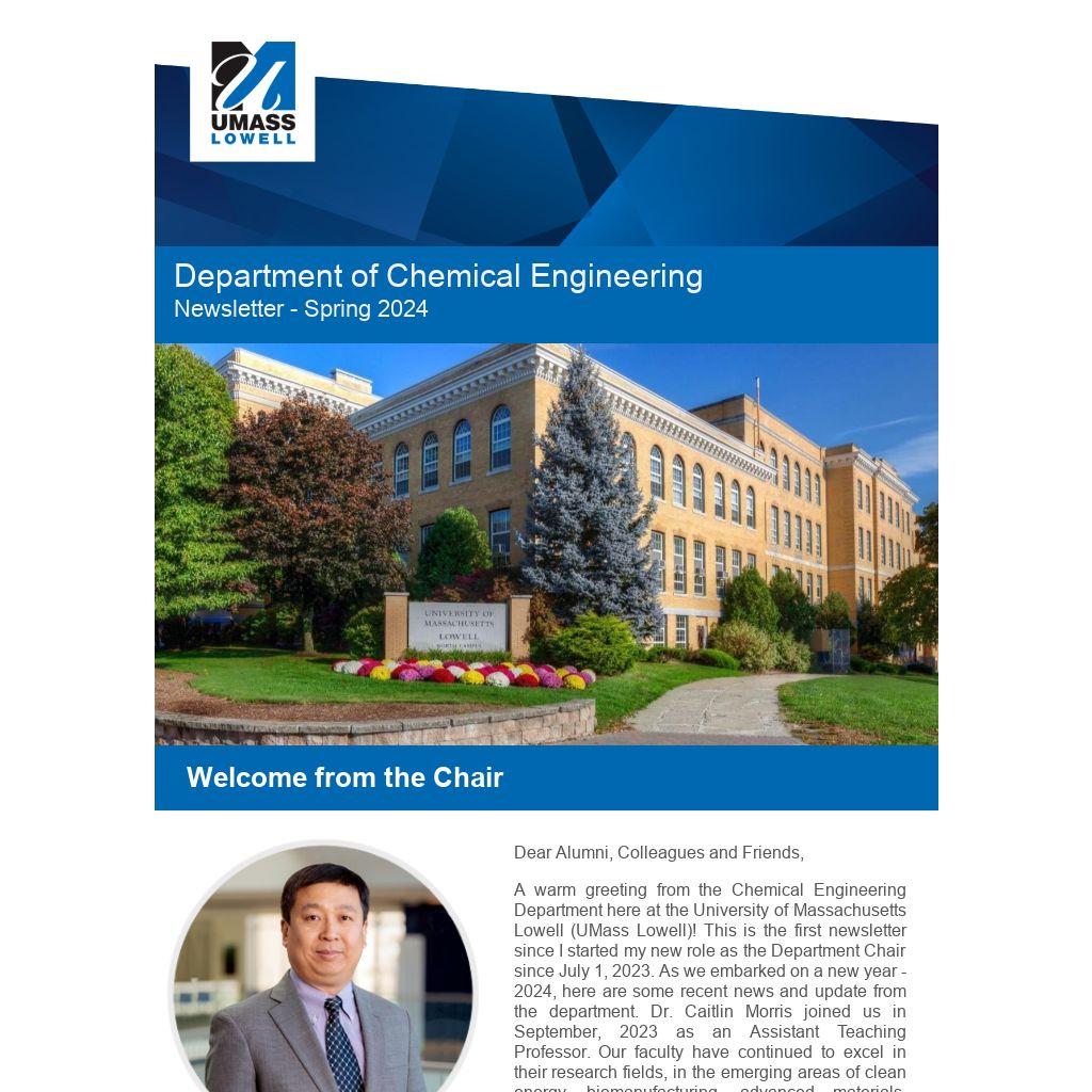 A warm greeting from the Chemical Engineering Department here at the University of Massachusetts Lowell (UMass Lowell)! This is the first newsletter since I started my new role as the Department Chair since July 1, 2023. As we embarked on a new year - 2024, here are some recent news and update from the department. Dr. Caitlin Morris joined us in September, 2023 as an Assistant Teaching Professor. Our faculty have continued to excel in their research fields, in the emerging areas of clean energy, biomanufacturing, advanced materials, nanotechnology, and sustainability, to name a few.