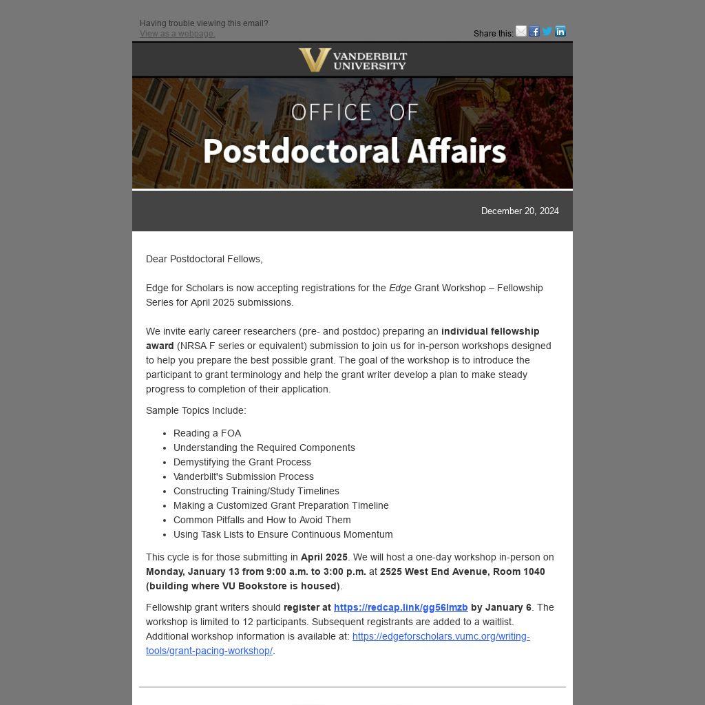 This cycle is for those submitting in April 2025. We will host a one-day workshop in-person on Monday, January 13 from 9:00 a.m. to 3:00 p.m. at 2525 West End Avenue, Room 1040 (building where VU Bookstore is housed).