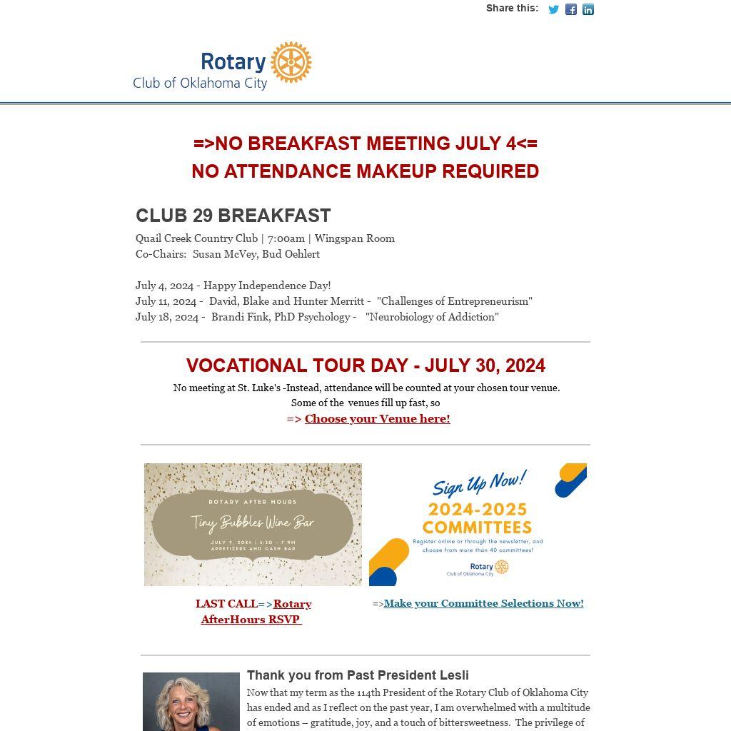 Now that my term as the 114th President of the Rotary Club of Oklahoma City has ended and as I reflect on the past year, I am overwhelmed with a multitude of emotions – gratitude, joy, and a touch of bittersweetness. The privilege of serving in this capacity these past 12 months has been humbling, deeply rewarding, and one of the most rewarding and greatest honors of my life.