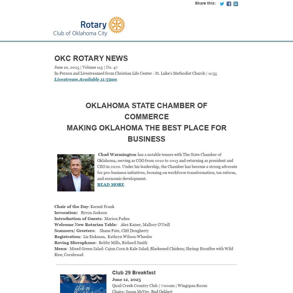 Rotary Club 29 has an online membership directory which contains current content information for all club members. The link to access the Club 29 directory can be found at the top of  the home page of  okcrotary.club or by clicking  here.