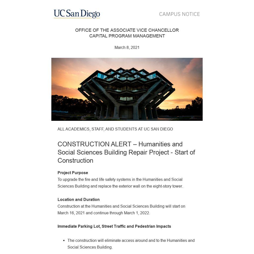 Construction at the Humanities and Social Sciences Building will start on March 16, 2021 and continue through March 1, 2022.