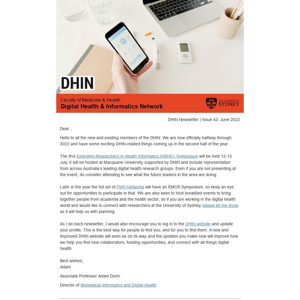 As I do each newsletter, I would also encourage you to log in to the DHIN website and update your profile. This is the best way for people to find you, and for you to find them. A new and improved DHIN website will soon be on its way, and the updates you make now will improve how we help you find new collaborators, funding opportunities, and connect with all things digital health.