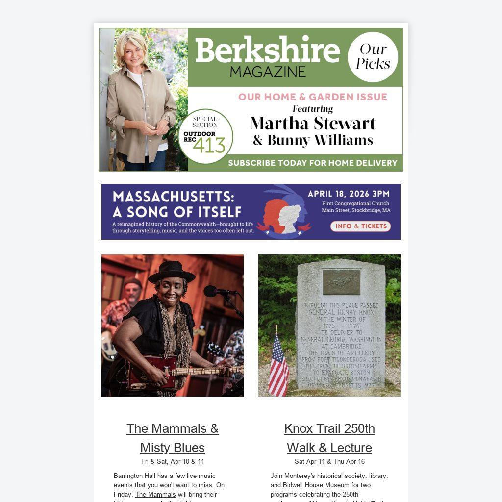 The Spring Home & Garden issue of Berkshire Magazine is on newsstands throughout the Berkshires and beyond! Martha Stewart is on the cover, heralding the Trade Secrets event that is coming up next month to support Project SAGE. There's so much to read; grab a copy while you can! Subscribe now