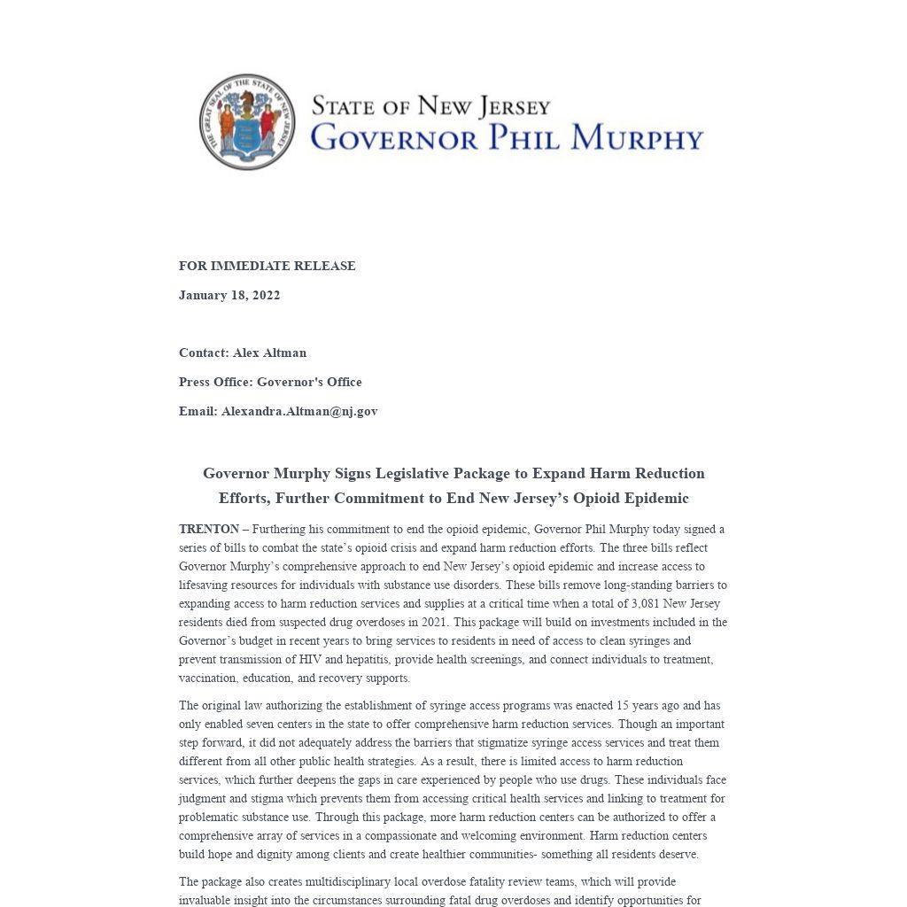 TRENTON – Furthering his commitment to end the opioid epidemic, Governor Phil Murphy today signed a series of bills to combat the state’s opioid crisis and expand harm reduction efforts. The three bills reflect Governor Murphy’s comprehensive approach to end New Jersey’s opioid epidemic and increase access to lifesaving resources for individuals with substance use disorders. These bills remove long-standing barriers to expanding access to harm reduction services and supplies at a critical time when a total of 3,081 New Jersey residents died from suspected drug overdoses in 2021. This package will build on investments included in the Governor’s budget in recent years to bring services to residents in need of access to clean syringes and prevent transmission of HIV and hepatitis, provide health screenings, and connect individuals to treatment, vaccination, education, and recovery supports.