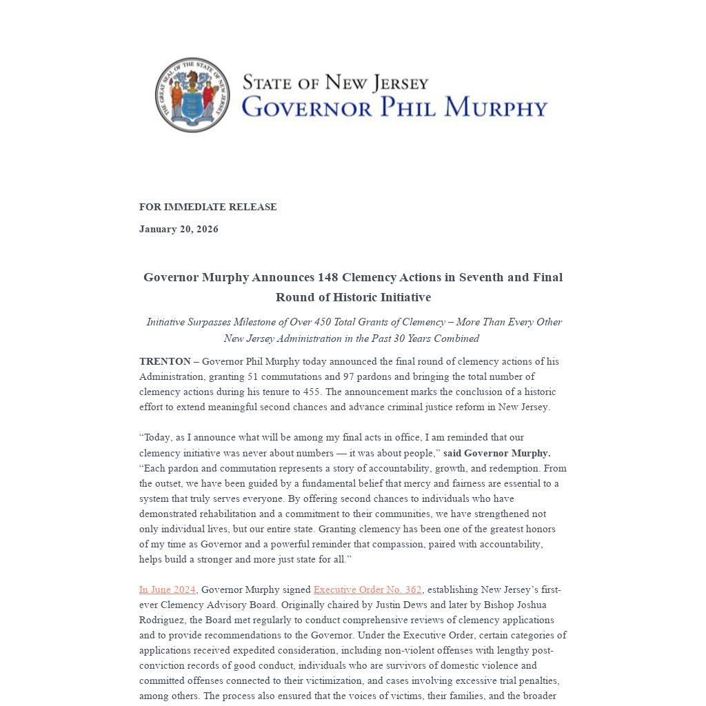 “Today, as I announce what will be among my final acts in office, I am reminded that our clemency initiative was never about numbers — it was about people,” said Governor Murphy. “Each pardon and commutation represents a story of accountability, growth, and redemption. From the outset, we have been guided by a fundamental belief that mercy and fairness are essential to a system that truly serves everyone. By offering second chances to individuals who have demonstrated rehabilitation and a commitment to their communities, we have strengthened not only individual lives, but our entire state. Granting clemency has been one of the greatest honors of my time as Governor and a powerful reminder that compassion, paired with accountability, helps build a stronger and more just state for all.”