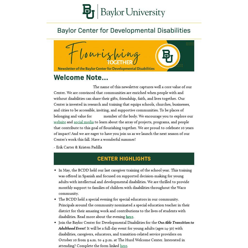 Flourishing Together. The name of this newsletter captures well a core value of our Center. We are convinced that communities are enriched when people with and without disabilities can share their gifts, friendship, faith, and lives together. Our Center is invested in research and training that equips schools, churches, businesses, and cities to be accessible, inviting, and supportive communities. To be places of belonging and value for every member of the body. We encourage you to explore our website and social media to learn about the array of projects, programs, and people that contribute to this goal of flourishing together. We are proud to celebrate 10 years of impact! And we are eager to have you join us as we launch the next season of our Center’s work this fall. Have a wonderful summer!