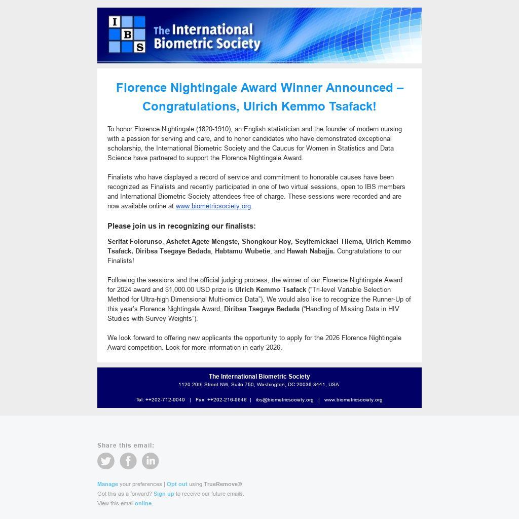 Following the sessions and the official judging process, the winner of our Florence Nightingale Award for 2024 award and $1,000.00 USD prize is Ulrich Kemmo Tsafack (“Tri-level Variable Selection Method for Ultra-high Dimensional Multi-omics Data”). We would also like to recognize the Runner-Up of this year’s Florence Nightingale Award, Diribsa Tsegaye Bedada (“Handling of Missing Data in HIV Studies with Survey Weights”).