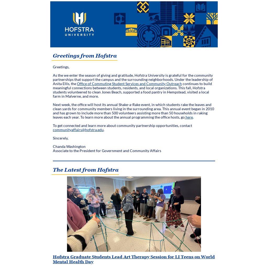 To get connected and learn more about community partnership opportunities, contact communityaffairs@hofstra.edu.