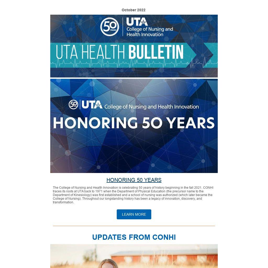 The College of Nursing and Health Innovation is celebrating 50 years of history beginning in the fall 2021. CONHI traces its roots at UTA back to 1971 when the Department of Physical Education (the precursor name to the Department of Kinesiology) was first established and a school of nursing was authorized (which later became the College of Nursing). Throughout our longstanding history has been a legacy of innovation, discovery, and transformation.