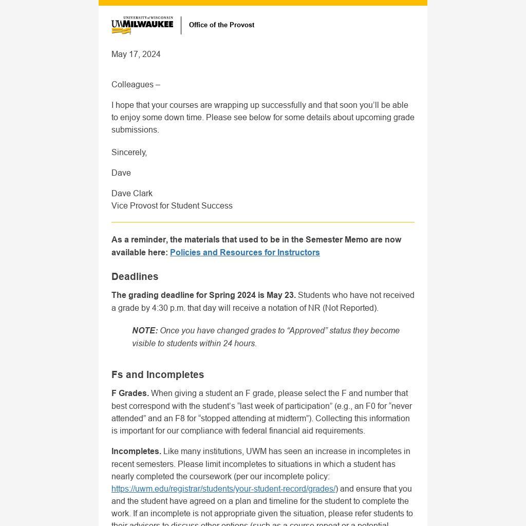 Incompletes. Like many institutions, UWM has seen an increase in incompletes in recent semesters. Please limit incompletes to situations in which a student has nearly completed the coursework (per our incomplete policy: https://uwm.edu/registrar/students/your-student-record/grades/) and ensure that you and the student have agreed on a plan and timeline for the student to complete the work. If an incomplete is not appropriate given the situation, please refer students to their advisors to discuss other options (such as a course repeat or a potential withdrawal appeal).