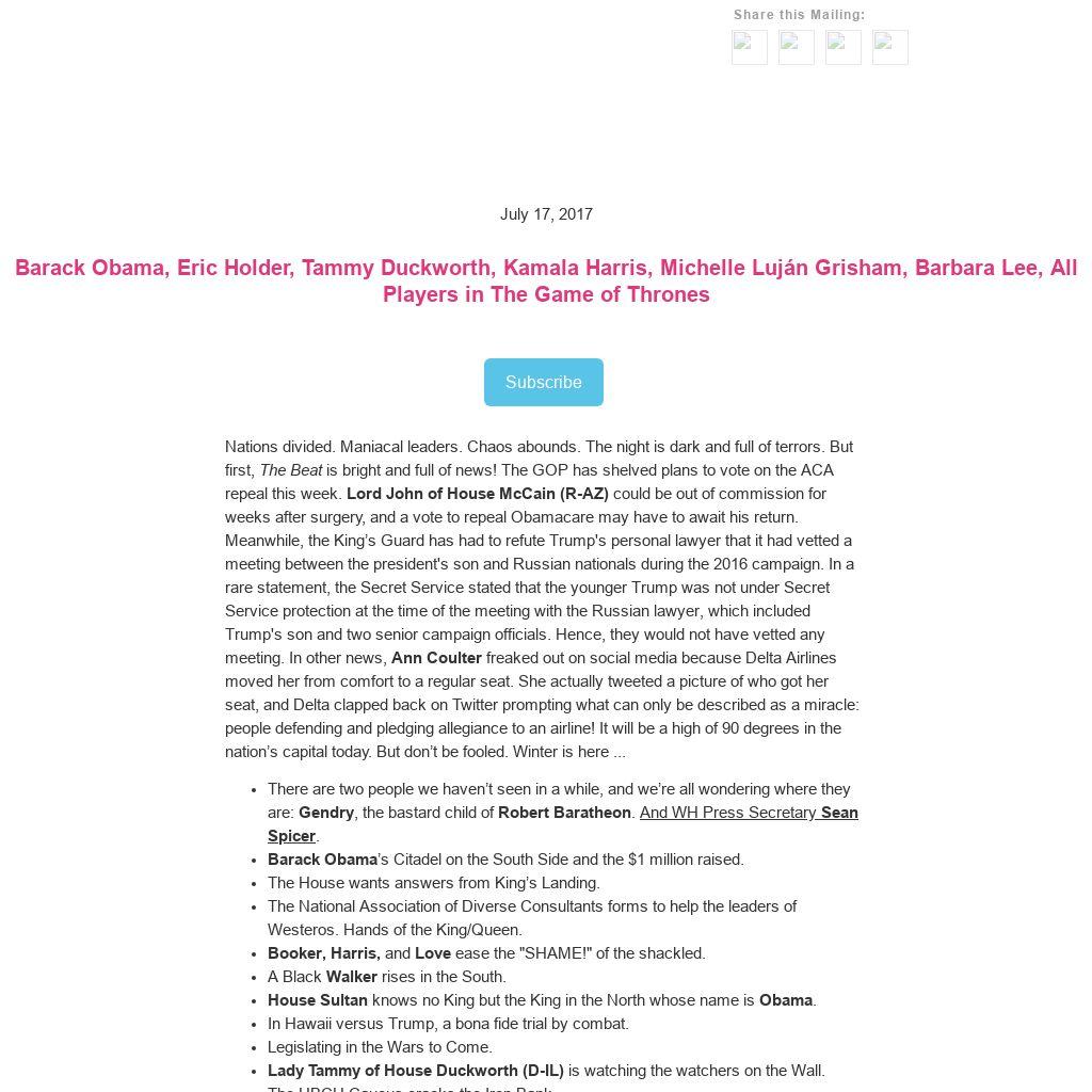Nations divided. Maniacal leaders. Chaos abounds. The night is dark and full of terrors. But first, The Beat is bright and full of news! The GOP has shelved plans to vote on the ACA repeal this week. Lord John of House McCain (R-AZ) could be out of commission for weeks after surgery, and a vote to repeal Obamacare may have to await his return. Meanwhile, the King’s Guard has had to refute Trump's personal lawyer that it had vetted a meeting between the president's son and Russian nationals during the 2016 campaign. In a rare statement, the Secret Service stated that the younger Trump was not under Secret Service protection at the time of the meeting with the Russian lawyer, which included Trump's son and two senior campaign officials. Hence, they would not have vetted any meeting. In other news, Ann Coulter freaked out on social media because Delta Airlines moved her from comfort to a regular seat. She actually tweeted a picture of who got her seat, and Delta clapped back on Twitter prompting what can only be described as a miracle: people defending and pledging allegiance to an airline! It will be a high of 90 degrees in the nation’s capital today. But don’t be fooled. Winter is here ...