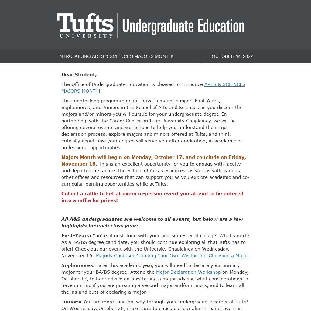 Majors Month will begin on Monday, October 17, and conclude on Friday, November 18. This is an excellent opportunity for you to engage with faculty and departments across the School of Arts & Sciences, as well as with various other offices and resources that can support you as you explore academic and co-curricular learning opportunities while at Tufts.