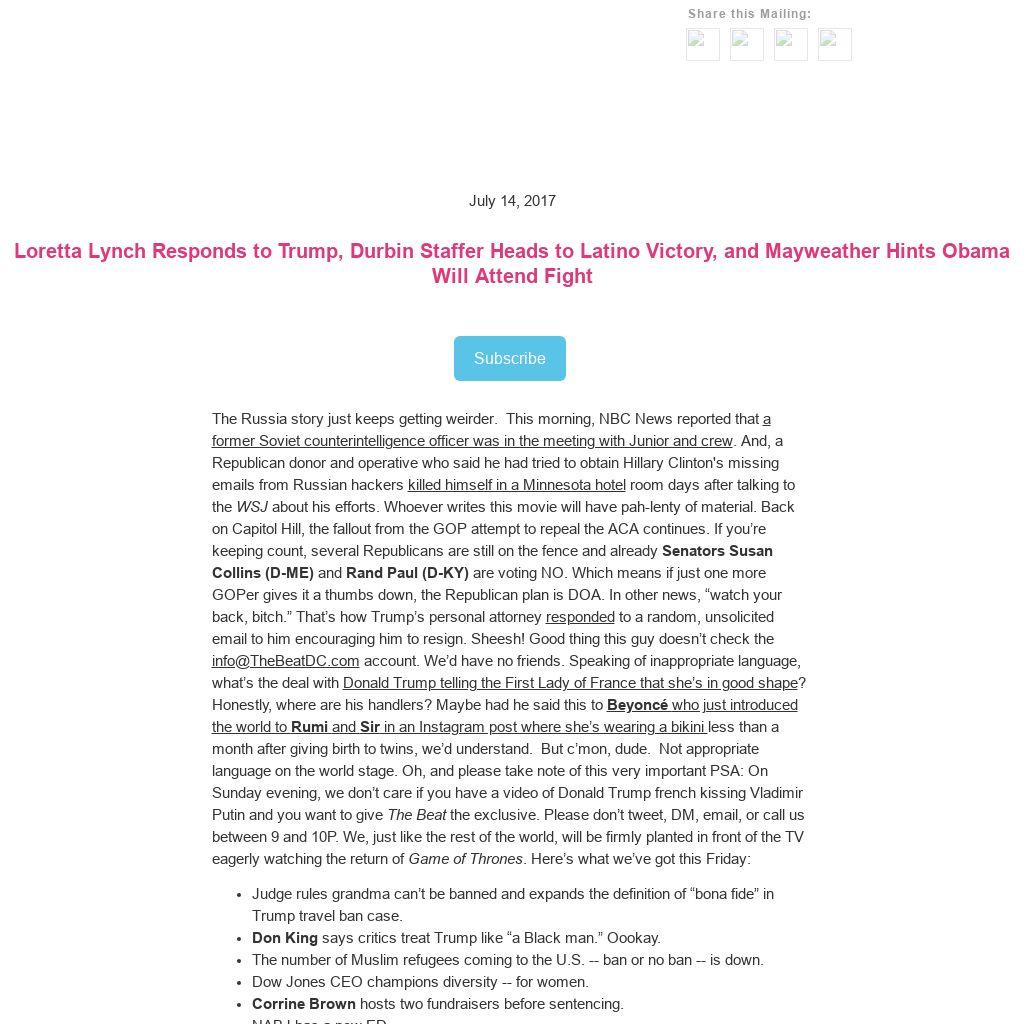 The Russia story just keeps getting weirder. This morning, NBC News reported that a former Soviet counterintelligence officer was in the meeting with Junior and crew. And, a Republican donor and operative who said he had tried to obtain Hillary Clinton's missing emails from Russian hackers killed himself in a Minnesota hotel room days after talking to the WSJ about his efforts. Whoever writes this movie will have pah-lenty of material. Back on Capitol Hill, the fallout from the GOP attempt to repeal the ACA continues. If you’re keeping count, several Republicans are still on the fence and already Senators Susan Collins (D-ME) and Rand Paul (D-KY) are voting NO. Which means if just one more GOPer gives it a thumbs down, the Republican plan is DOA. In other news, “watch your back, bitch.” That’s how Trump’s personal attorney responded to a random, unsolicited email to him encouraging him to resign. Sheesh! Good thing this guy doesn’t check the info@TheBeatDC.com account. We’d have no friends. Speaking of inappropriate language, what’s the deal with Donald Trump telling the First Lady of France that she’s in good shape? Honestly, where are his handlers? Maybe had he said this to Beyoncé who just introduced the world to Rumi and Sir in an Instagram post where she’s wearing a bikini less than a month after giving birth to twins, we’d understand. But c’mon, dude. Not appropriate language on the world stage. Oh, and please take note of this very important PSA: On Sunday evening, we don’t care if you have a video of Donald Trump french kissing Vladimir Putin and you want to give The Beat the exclusive. Please don’t tweet, DM, email, or call us between 9 and 10P. We, just like the rest of the world, will be firmly planted in front of the TV eagerly watching the return of Game of Thrones. Here’s what we’ve got this Friday: - Judge rules grandma can’t be banned and expands the definition of “bona fide” in Trump travel ban case.