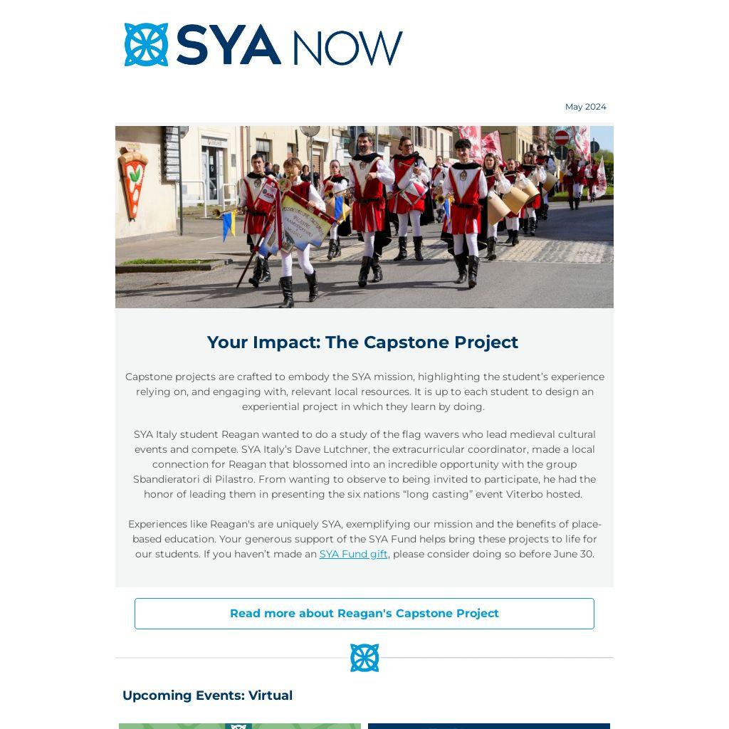 Capstone projects are crafted to embody the SYA mission, highlighting the student’s experience relying on, and engaging with, relevant local resources. It is up to each student to design an experiential project in which they learn by doing.
