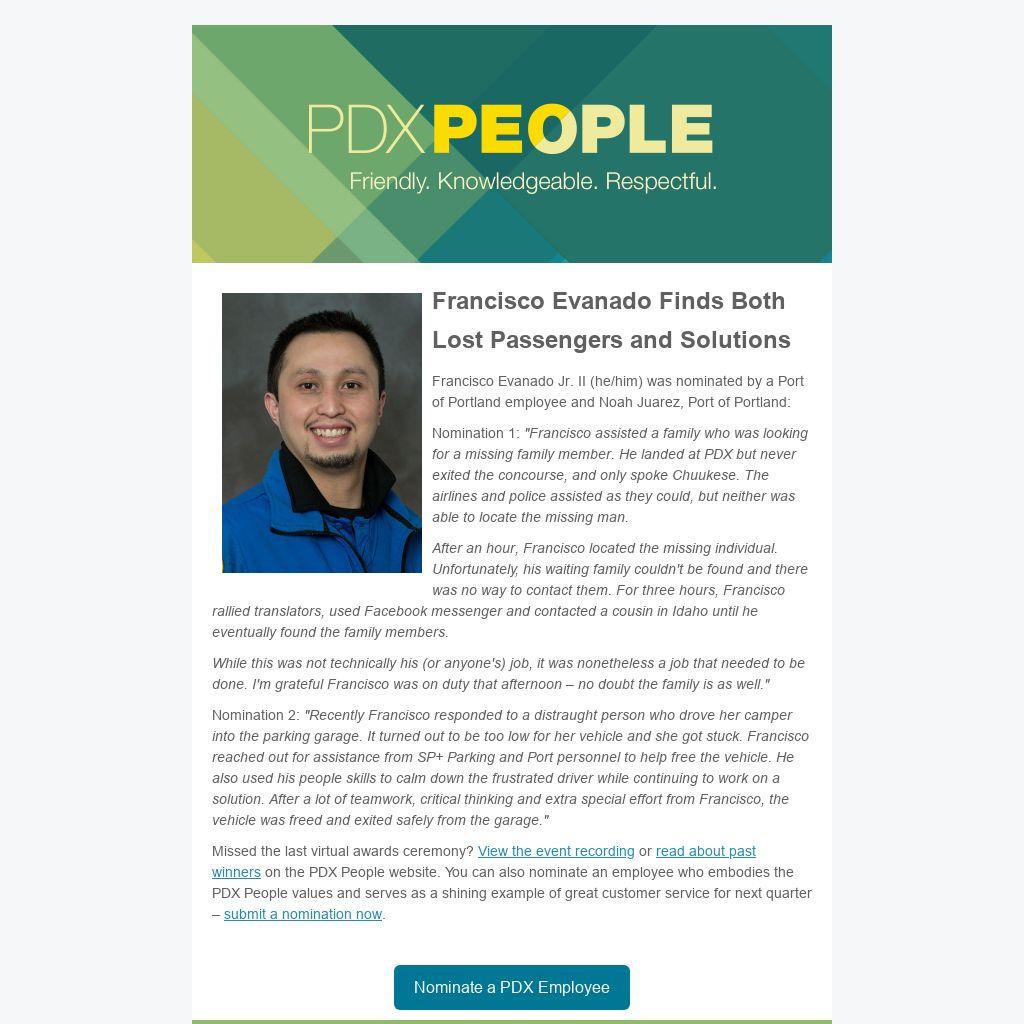 Nomination 1: "Francisco assisted a family who was looking for a missing family member. He landed at PDX but never exited the concourse, and only spoke Chuukese. The airlines and police assisted as they could, but neither was able to locate the missing man.