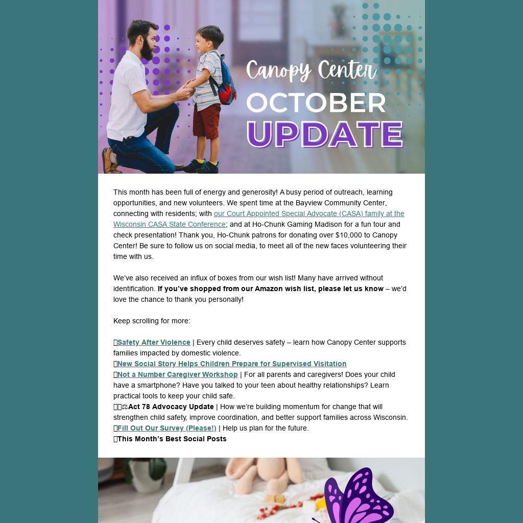 This month has been full of energy and generosity! A busy period of outreach, learning opportunities, and new volunteers. We spent time at the Bayview Community Center, connecting with residents; with our Court Appointed Special Advocate (CASA) family at the Wisconsin CASA State Conference; and at Ho-Chunk Gaming Madison for a fun tour and check presentation! Thank you, Ho-Chunk patrons for donating over $10,000 to Canopy Center! Be sure to follow us on social media, to meet all of the new faces volunteering their time with us.Â