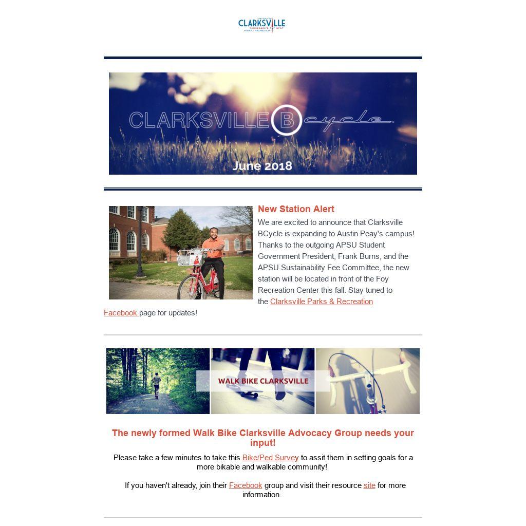 We are excited to announce that Clarksville BCycle is expanding to Austin Peay's campus! ThanksĀ to the outgoing APSU Student Government President,Ā Frank Burns, and the APSU Sustainability Fee Committee, the new station will be located in front of the Foy Recreation Center this fall. Stay tuned to theĀ Clarksville Parks & Recreation FacebookĀ pageĀ for updates!Ā