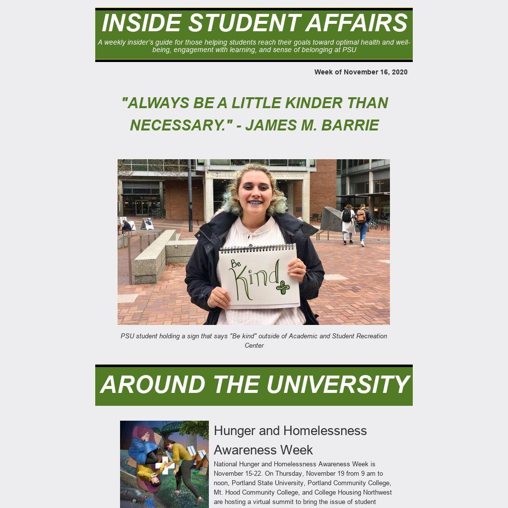 INSIDE STUDENT AFFAIRSA weekly insider’s guide for those helping students reach their goals toward optimal health and well-being, engagement with learning, and sense of belonging at PSU