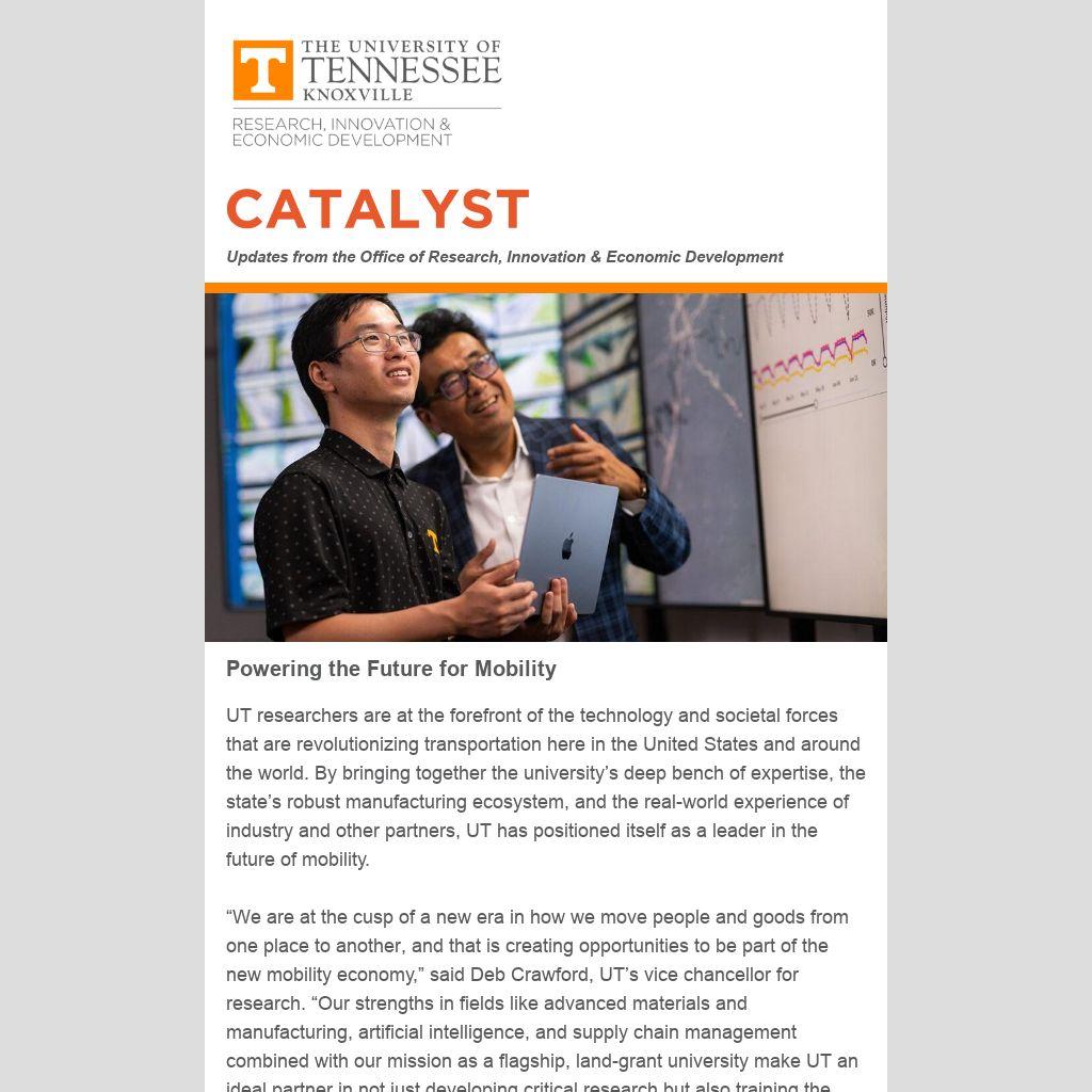 “We are at the cusp of a new era in how we move people and goods from one place to another, and that is creating opportunities to be part of the new mobility economy,” said Deb Crawford, UT’s vice chancellor for research. “Our strengths in fields like advanced materials and manufacturing, artificial intelligence, and supply chain management combined with our mission as a flagship, land-grant university make UT an ideal partner in not just developing critical research but also training the future workforce and crafting the public policies we need.”