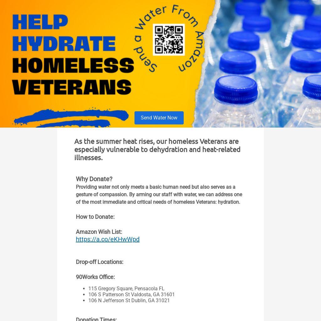 Providing water not only meets a basic human need but also serves as a gesture of compassion. By arming our staff with water, we can address one of the most immediate and critical needs of homeless Veterans: hydration.