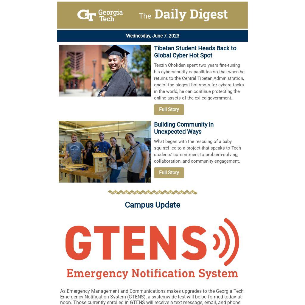 As Emergency Management and Communications makes upgrades to the Georgia Tech Emergency Notification System (GTENS), a systemwide test will be performed today at noon. Those currently enrolled in GTENS will receive a text message, email, and phone call during the test. To confirm your enrollment in GTENS, or update your contact information for this service, visit passport.gatech.edu.