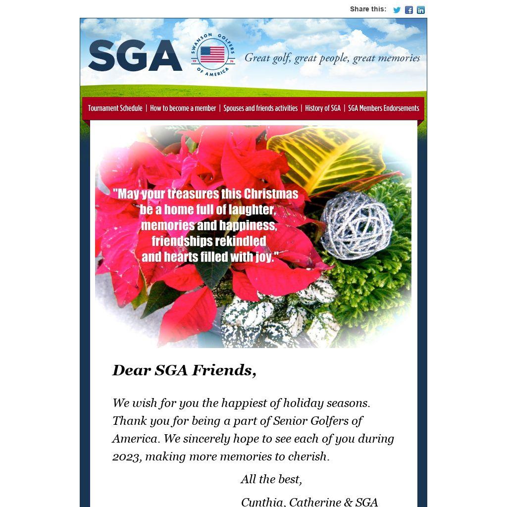 We wish for you the happiest of holiday seasons. Thank you for being a part of Senior Golfers of America. We sincerely hope to see each of you during 2023, making more memories to cherish.