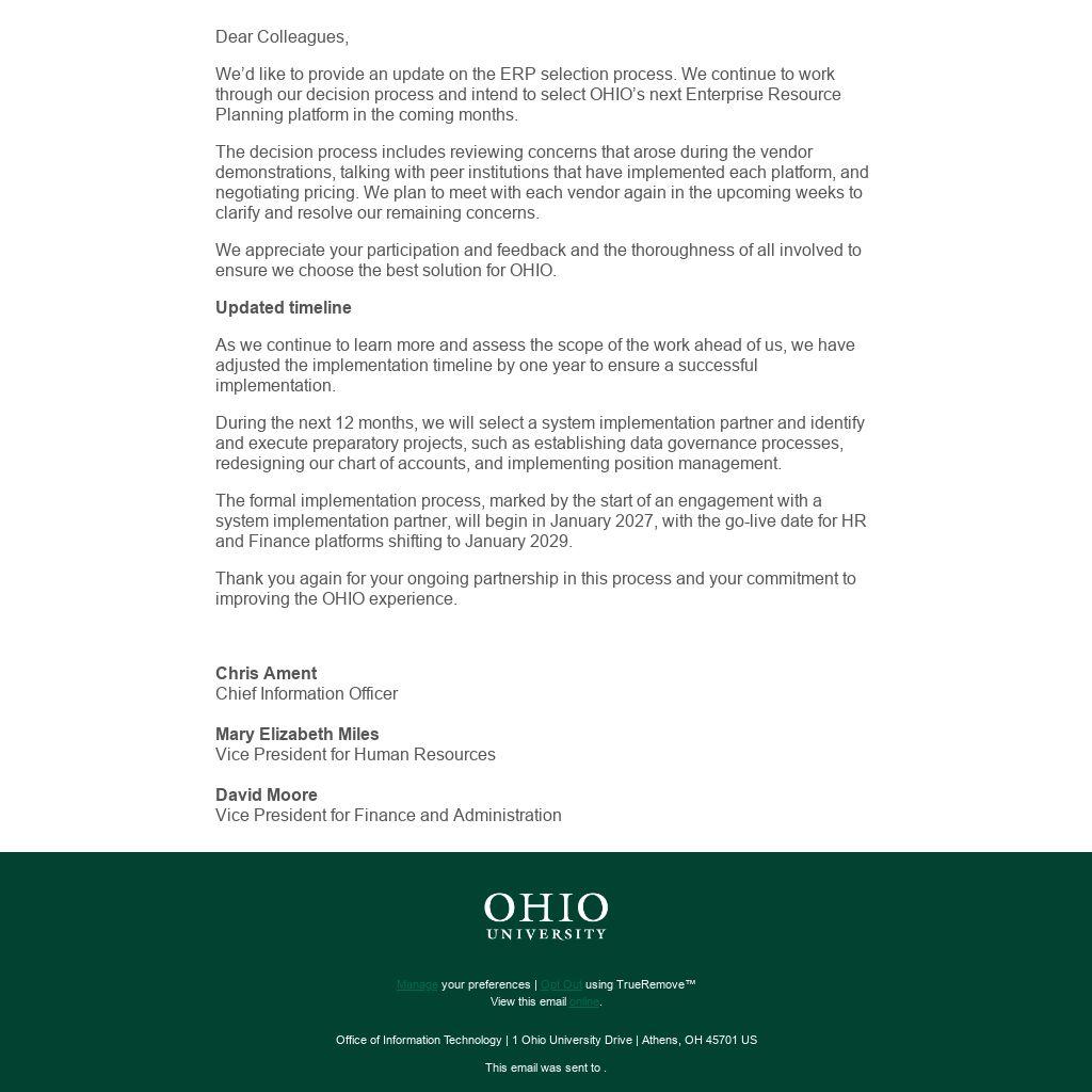 We’d like to provide an update on the ERP selection process. We continue to work through our decision process and intend to select OHIO’s next Enterprise Resource Planning platform in the coming months.