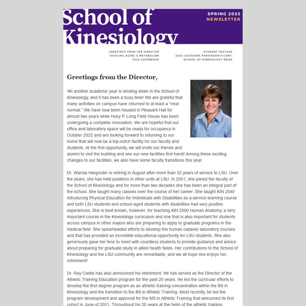 Yet another academic year is winding down in the School of Kinesiology, and it has been a busy time! We are grateful that many activities on campus have returned to at least a “near normal.” We have now been housed in Pleasant Hall for almost two years while Huey P. Long Field House has been undergoing a complete renovation. We are hopeful that our office and laboratory space will be ready for occupancy in October 2022 and are looking forward to returning to our home that will now be a top-notch facility for our faculty and students. At the first opportunity, we will invite our friends and alumni to visit the building and see our new facilities first hand! Among these exciting changes to our facilities, we also have some faculty transitions this year.