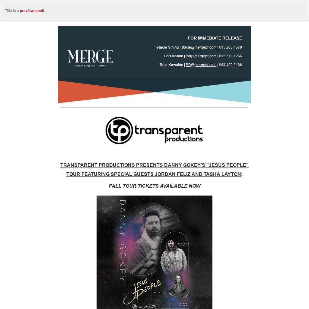 TRANSPARENT PRODUCTIONS PRESENTS DANNY GOKEY'S "JESUS PEOPLE" TOUR FEATURING SPECIAL GUESTS JORDAN FELIZ AND TASHA LAYTON;
