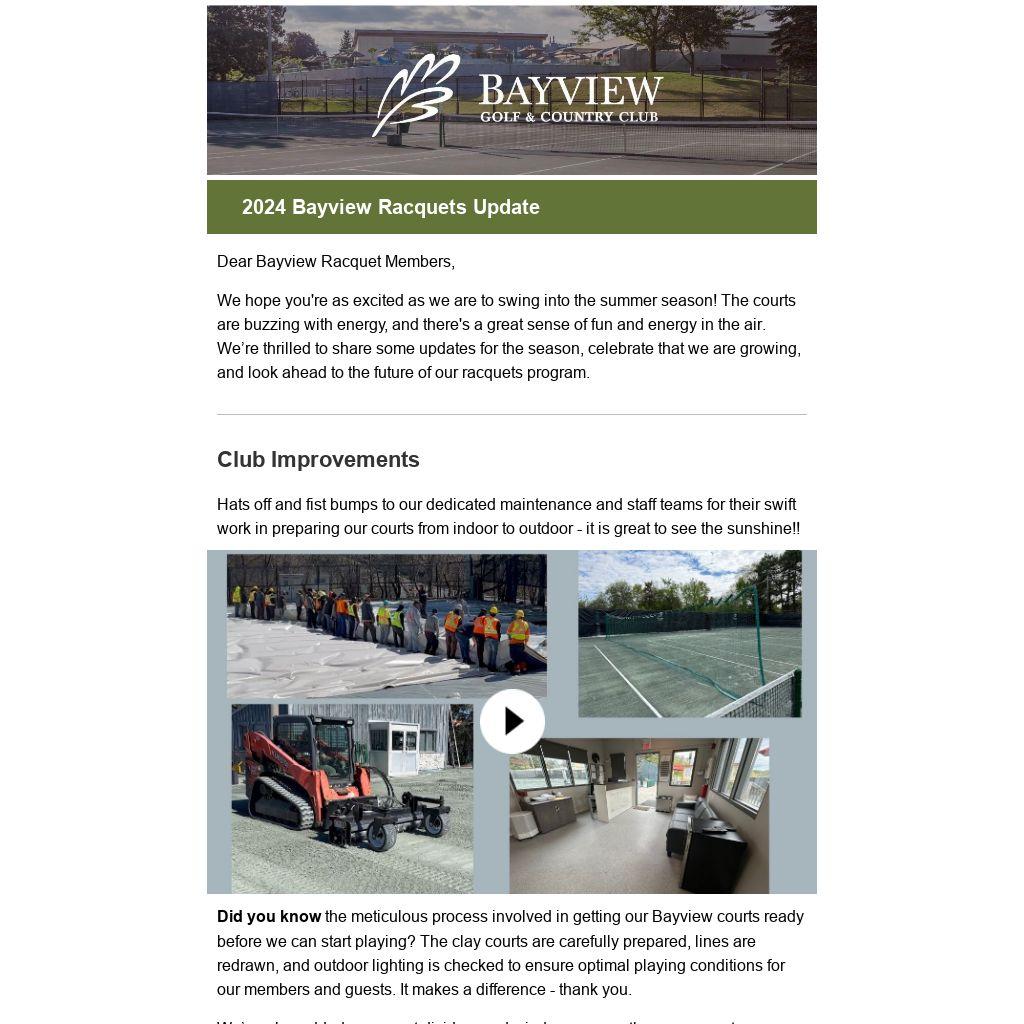 As you will have seen around our club, there is a lot of activity. Our club’s building projects around the Women’s locker room upgrades, our Outdoor Dining patio and dining room have all been well received. As we think about the future and building needs for the Bayview Racquets program, we are thinking of many elements. While there has been discussion about a washroom, we are taking a more holistic approach and have looked at updating the entire building while at the same time adding washroom facilities and the required infrastructure necessary. We are working together with management to determine whether this can meet the needs, understanding costs and timeline requirements. There will be more communication looking for our member’s input and feedback on what is needed for this project to deliver on our member's needs and planning goals. Stay tuned for more in this area.