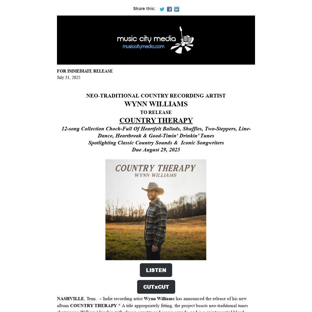 NASHVILLE, Tenn.  – Indie recording artist Wynn Williams has announced the release of his new album COUNTRY THERAPY.* A title appropriately fitting, the project boasts neo-traditional tunes showcasing Williams' kinship with classic country and iconic sounds, and is a quintessential blend favoring influences enriched by popular, trendsetting 90s and 00s recordings akin to legendary live entertainers and honky tonkers, George Strait, Brooks & Dunn and Tim McGraw.