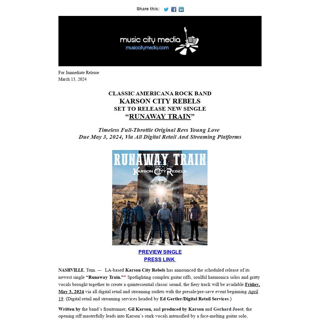 NASHVILLE, Tenn. — LA-based Karson City Rebels has announced the scheduled release of its newest single “Runaway Train.”* Spotlighting complex guitar riffs, soulful harmonica solos and gritty vocals brought together to create a quintessential classic sound, the fiery track will be available Friday, May 3, 2024 via all digital retail and streaming outlets with the presale/pre-save event beginning April 19. (Digital retail and streaming services headed by Ed Gertler/Digital Retail Services.)
