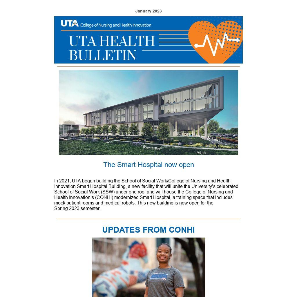 In 2021, UTA began building the School of Social Work/College of Nursing and Health Innovation Smart Hospital Building, a new facility that will unite the University’s celebrated School of Social Work (SSW) under one roof and will house the College of Nursing and Health Innovation’s (CONHI) modernized Smart Hospital, a training space that includes mock patient rooms and medical robots. This new building is now open for the Spring 2023 semester.