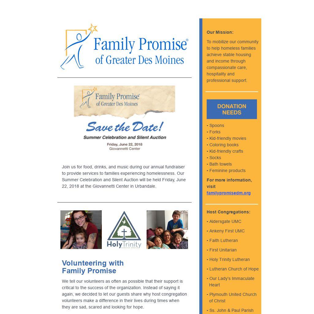 Thank you, again, to all of the volunteers who help our guest families in their greatest time of need. If you aren’t yet a volunteer, but would like to learn more about it, please contact Executive Director Jim Cain at jcain@familypromisedm.org.